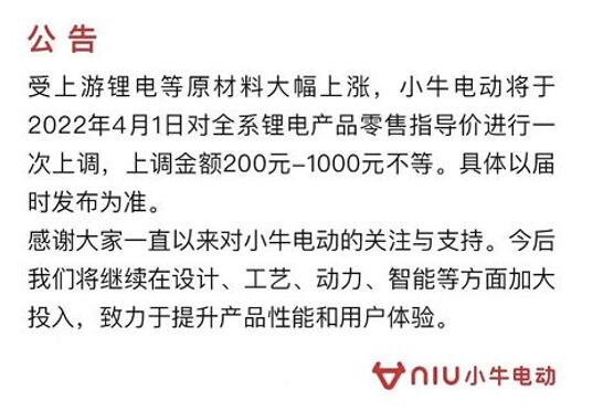 21日,小牛电动发布公告称,受上游锂电等原材料价格大幅上涨,小牛电动将于2022年4月1日对全系锂电产品零售指导价进行一次上调,上调金额200-1000元不等,具体以届时发布为准。
