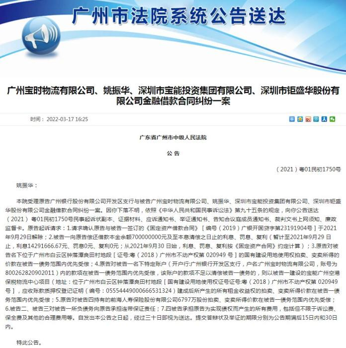 广州市中级人民法院公告涉及广州银行股份有限公司开发区支行与广州宝时物流有限公司、姚振华、深圳市宝能投资集团有限公司、深圳市钜盛华股份有限公司金融借款合同纠纷一案。