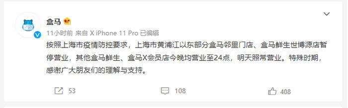 盒马回应上海所有门店关闭:只涉及部分门店