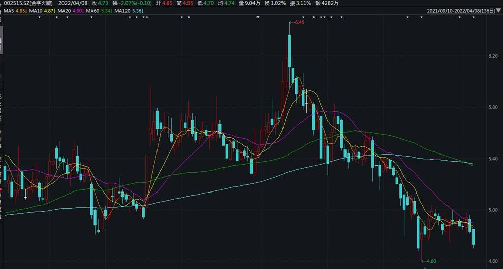 Wind数据显示,今年1月中旬以来,金字火腿股价一路下跌,从6.46元/股跌至4.73元/股,跌幅超23%,截至4月8日收盘,金字火腿总市值46亿元。