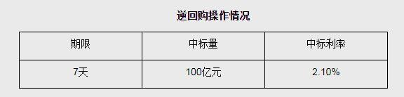 据中国人民银行官网消息,为维护银行体系流动性合理充裕,2022年4月14日人民银行以利率招标方式开展了100亿元逆回购操作,期限为7天,中标利率2.10%。