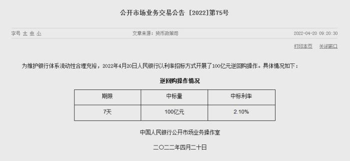 据央行官网消息,为维护银行体系流动性合理充裕,2022年4月20日人民银行以利率招标方式开展了100亿元逆回购操作。期限为7天,中标利率为2.10%,与此前持平。