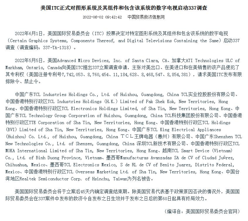 美国ITC对图形系统及相关数字电视启动337调查,TCL等成列名被告