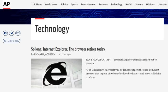 据美联社报道,微软公司将于6月15日永久关闭IE浏览器。微软公司向用户推荐使用该公司在2015年推出的Edge浏览器。