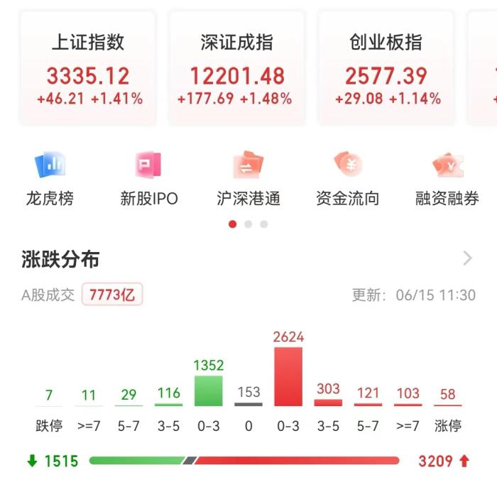6月15日,A股三大股指早盘大幅震荡,截至午间收盘,沪指涨1.41%重回3300点之上,深成指和创业板指亦涨超1%。两市超3200股上涨,成交额半天已超7000亿元。盘面上,金融股崛起,保险板块大涨逾7%,证券、多元金融板块亦涨幅靠前;另,房地产、家居用品、酒店餐饮等行业板块表现亮眼。