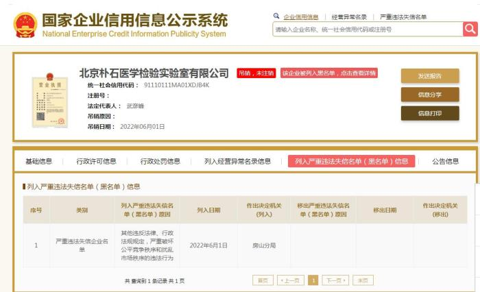国家企业信用信息公示系统显示,近日,北京朴石医学检验实验室有限公司因其他违反法律、行政法规规定,严重破坏公平竞争秩序和扰乱市场秩序的违法行为,被列入严重违法失信企业名单。