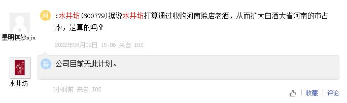 针对“据说水井坊打算通过收购河南赊店老酒,从而扩大白酒大省河南的市占率”的提问,水井坊6月20日在上证e互动平台表示 ,公司目前无此计划。