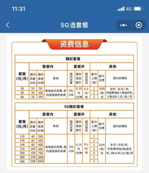 27日,中国广电5G正式放号,“中国广电营业厅”微信小程序显示,中国广电共推出了多档5G套餐,其中,最低档为38元/月,包含10G流量和50分钟国内语音;最高档为588元/月,包含398G流量和1600分钟国内语音。