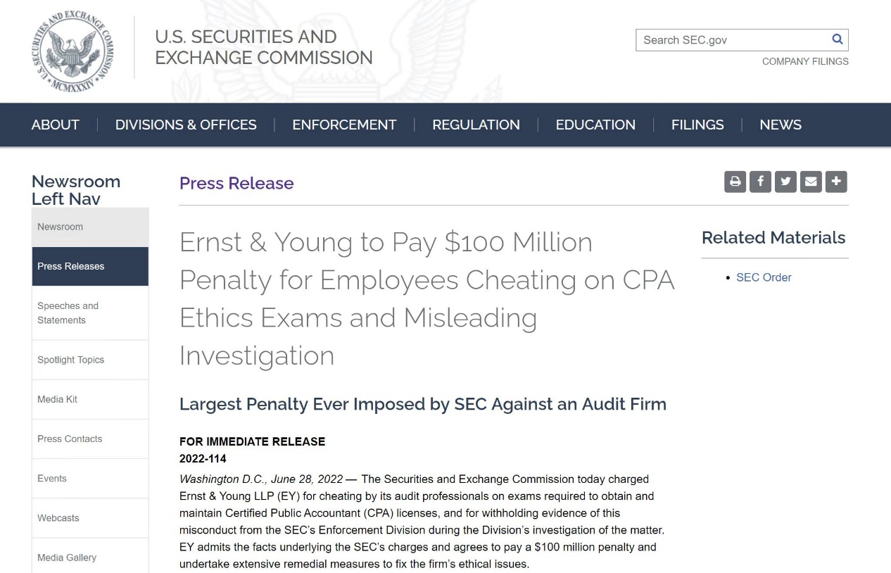 SEC披露的调查文件显示,有49名安永审计师在2017至2021年间的CPA考试中向他人发送或接收了该考试道德部分(Ethics)的答案,另有数百名审计师在维持CPA执照所需的继续教育课程(CPE)中作弊。