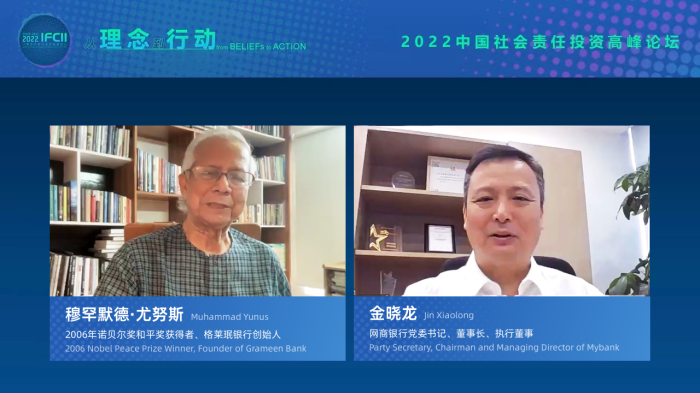 6月30日消息,在2022中国社会责任投资高峰论坛预热环节,举办了一场关于社会责任投资与社会企业的对话。2006年诺贝尔和平奖获得者、格莱珉银行创始人穆罕默德•尤努斯、网商银行董事长金晓龙,以及IFCII秘书长、中国普惠金融研究院(CAFI)院长贝多广等嘉宾参会。