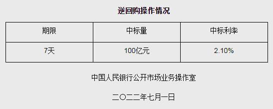 央行进行100亿元7天期逆回购操作 中标利率2.10%
