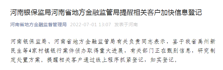 1日,河南省地方金融监督管理局公众号发布消息称,河南银保监局、河南省地方金融监管局有关负责同志表示,鉴于我省禹州新民生等4家村镇银行案件侦办取得重大进展,有关部门正在甄别信息,研究制定处置方案。提醒相关客户通过线上程序抓紧登记,如实登记。