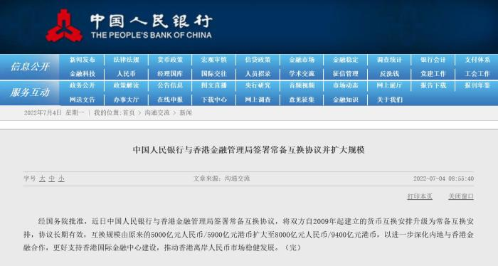 中国人民银行与香港金融管理局签署常备互换协议并扩大规模