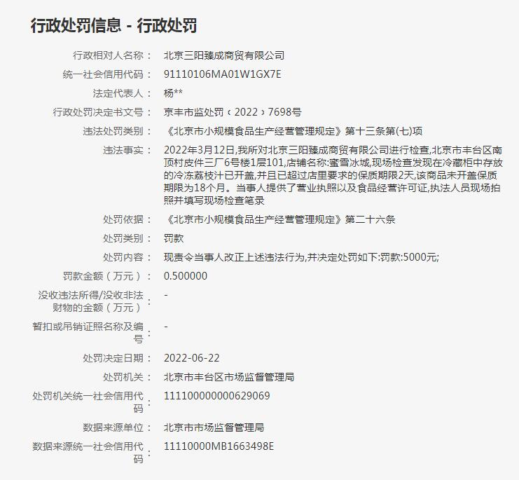 信用中国(北京)网站显示,近日,北京三阳臻成商贸有限公司因违反《北京市小规模食品生产经营管理规定》,被北京市丰台区市场监督管理局罚款5000元。违法事实显示,该公司店铺名称为蜜雪冰城,2022年3月12日对该公司进行现场检查时,发现在冷藏柜中存放的冷冻荔枝汁已开盖,并且已超过店里要求的保质期限2天,该商品未开盖保质期限为18个月。