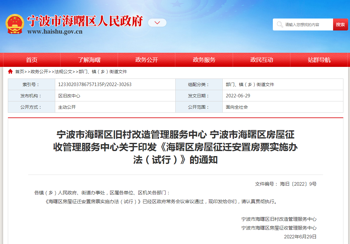 据宁波市海曙区政府官网,宁波市海曙区旧村改造管理服务中心、宁波市海曙区房屋征收管理服务中心近日印发《海曙区房屋征迁安置房票实施办法(试行)》(下称《实施办法(试行)》)。
