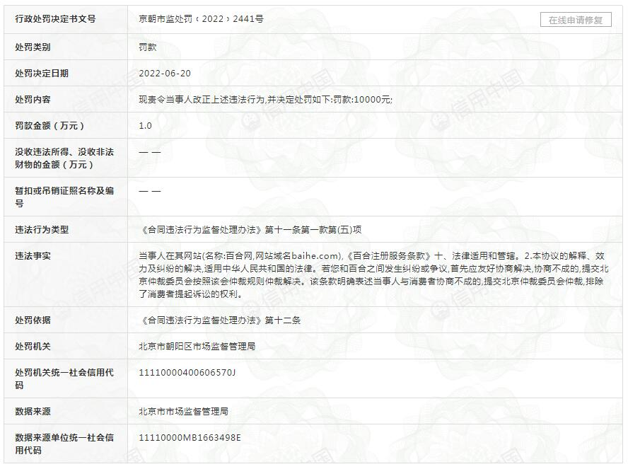 信用中国显示,百合佳缘网络集团股份有限公司因违反《合同违法行为监督处理办法》,被北京市朝阳区市场监督管理局罚款1万。