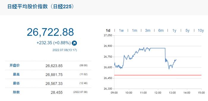 日经225指数官网显示,日经225指数午后一度跳水,后有所回涨,截至当地时间13时17分,日经225指数涨0.88%报26722.88点。