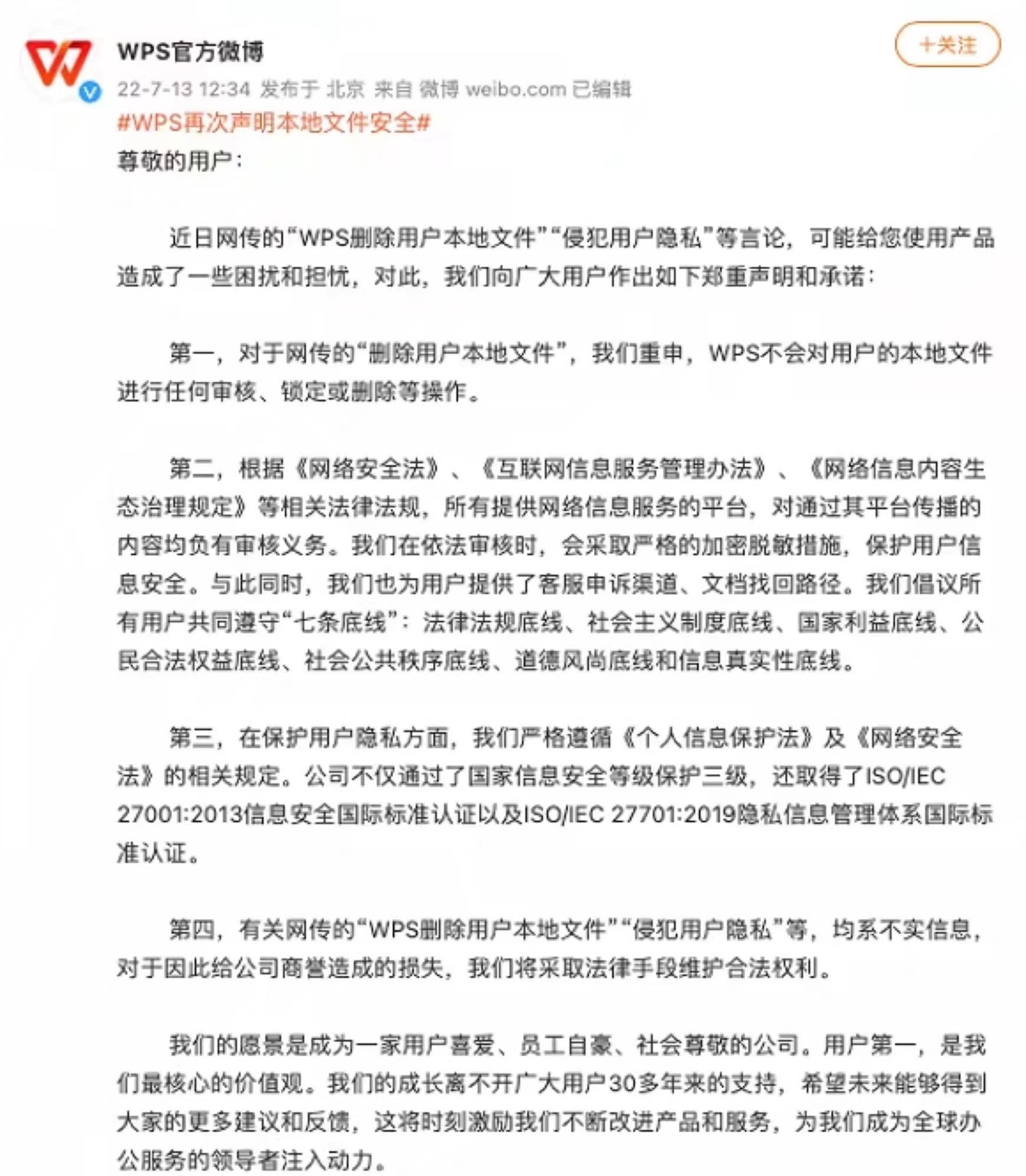 13日,针对用户投诉WPS远程锁死用户文档一事,WPS再发声明称:对于网传的“删除用户本地文件”,我们重申,WPS不会对用户的本地文件进行任何审核、锁定或删除等操作。