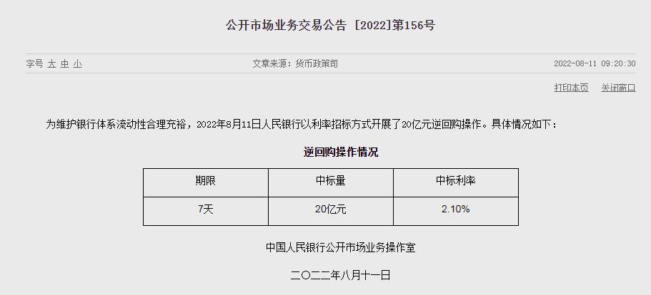据央行网站11日消息,为维护银行体系流动性合理充裕,2022年8月11日人民银行以利率招标方式开展了20亿元逆回购操作。中标利率为2.10%。