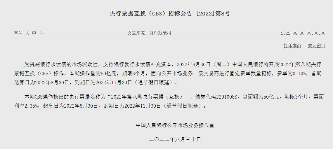 央行网站8月30日消息,为提高银行永续债的市场流动性,支持银行发行永续债补充资本,2022年8月30日(周二)中国人民银行将开展2022年第八期央行票据互换(CBS)操作。本期操作量为50亿元,期限3个月,面向公开市场业务一级交易商进行固定费率数量招标,费率为0.10%,首期结算日为2022年8月30日,到期日为2022年11月30日(遇节假日顺延)。