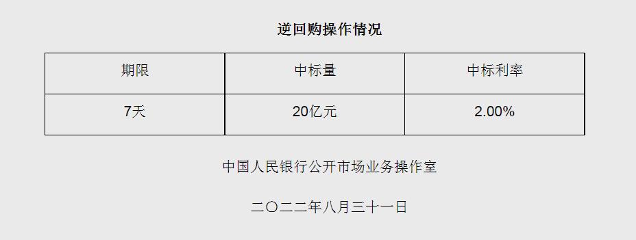 据央行网站31日消息,为维护银行体系流动性合理充裕,2022年8月31日人民银行以利率招标方式开展了20亿元逆回购操作,中标利率为2.00%。