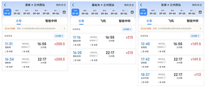 停运近8个月的兰新高铁于9月1日部分恢复购票。中新财经发现,从9月1日起,在12306铁路订票软件上已经可以购买从甘肃河西走廊地区的酒泉、嘉峪关、张掖开往兰州西的D4934、D4932次列车车票,9月2日起可购买由兰州向西出发前往嘉峪关、张掖等地的D4931次列车车票。但兰州和乌鲁木齐之间动车车票目前还未恢复。