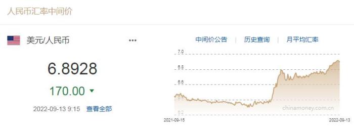 中国人民银行授权中国外汇交易中心公布,9月13日银行间外汇市场人民币对美元汇率中间价报6.8928,调升170个基点。