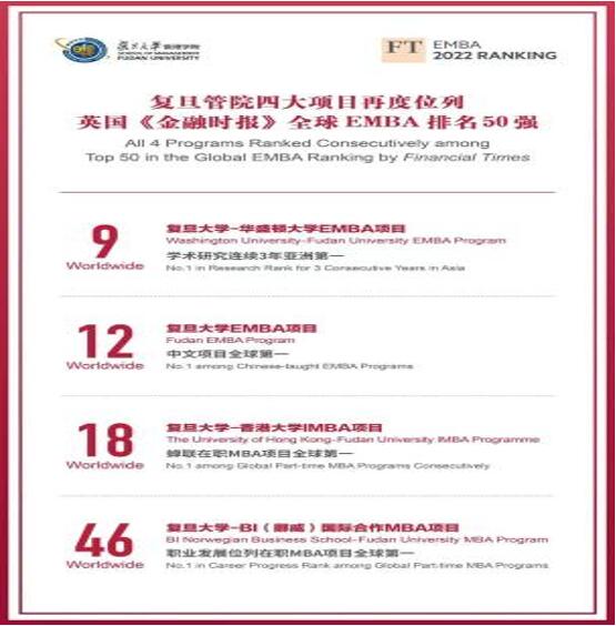 英国《金融时报》(FT)17日发布全球EMBA项目排名,复旦大学EMBA项目位列全球第12位、中文项目全球第一;复旦大学-华盛顿大学EMBA项目位列全球第9位,学术研究单项指标连续三年位列亚洲第一;复旦大学-香港大学IMBA项目位列全球第18位,蝉联在职MBA项目全球第一。