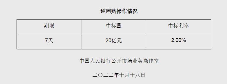据央行官网消息,为维护银行体系流动性合理充裕,2022年10月18日人民银行以利率招标方式开展了20亿元逆回购操作,中标利率为2.00%。