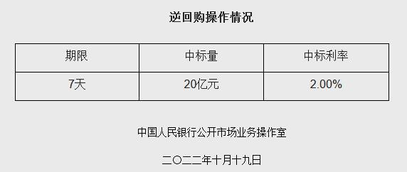 据央行官网消息,为维护银行体系流动性合理充裕,2022年10月19日人民银行以利率招标方式开展了20亿元逆回购操作,中标利率为2.00%。