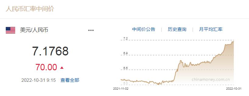 10月31日人民币兑美元中间价报7.1768 调贬70个基点