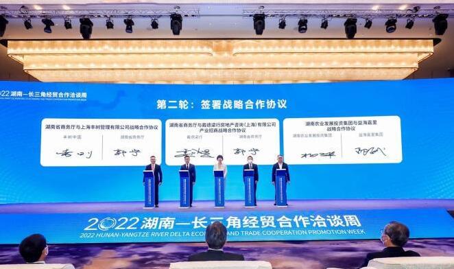 签约仪式上,湖南省人民政府与上海证券交易所签署战略合作备忘录,湖南省商务厅分别与上海丰树管理有限公司、戴德梁行房地产咨询(上海)有限公司签署战略合作协议,湖南农业发展投资集团与益海嘉里集团签署战略合作协议。