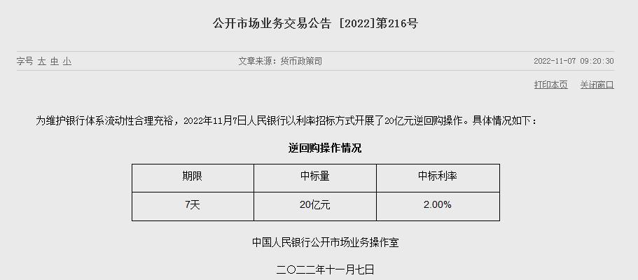 据央行官网消息,为维护银行体系流动性合理充裕,2022年11月7日人民银行以利率招标方式开展了20亿元逆回购操作,中标利率为2.00%。