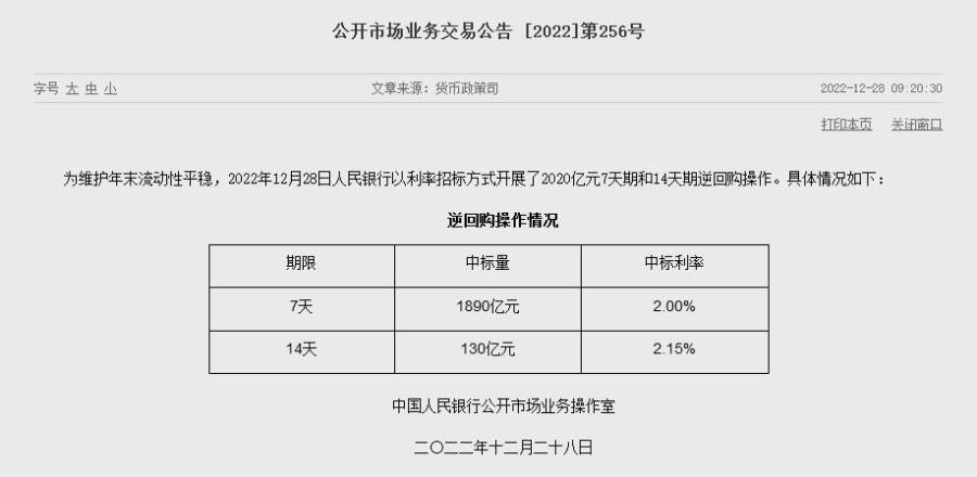 据央行网站消息,为维护年末流动性平稳,2022年12月28日人民银行以利率招标方式开展了2020亿元7天期和14天期逆回购操作,中标利率分别为2.0%、2.15%。