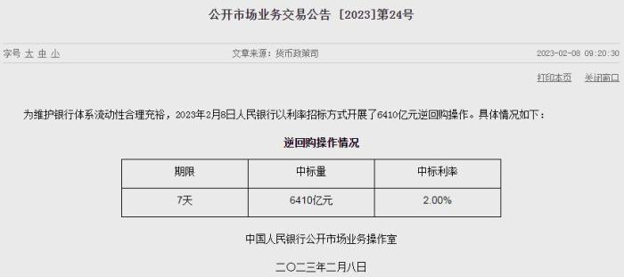 据央行网站消息,为维护银行体系流动性合理充裕,2023年2月8日人民银行以利率招标方式开展了6410亿元逆回购操作,中标利率2.00%。