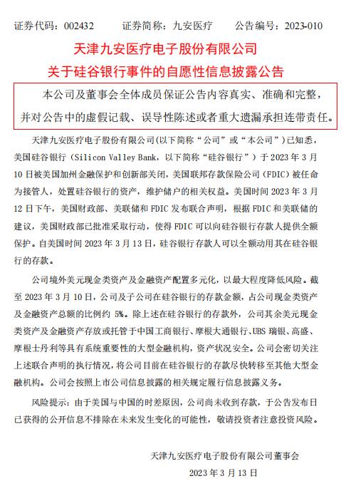 九安医疗公告称,公司会密切关注上述联合声明的执行情况,将公司目前在硅谷银行的存款尽快转移至其他大型金融机构。公司会按照上市公司信息披露的相关规定履行信息披露义务。