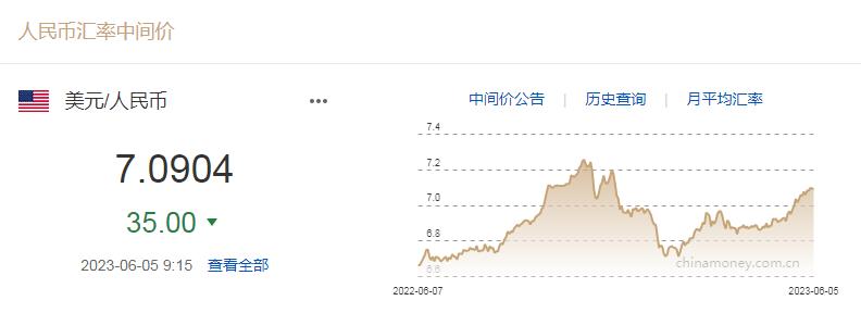 据中国外汇交易中心网站5日消息,2023年6月5日人民币兑美元汇率中间价报7.0904,较前一交易日上调35个基点。