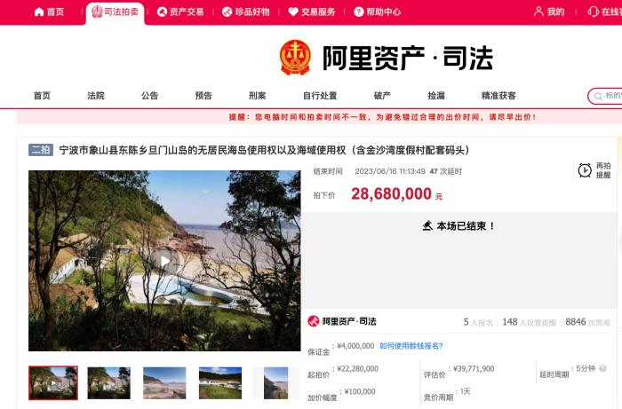 几天后,宁波市中级人民法院发布了二拍公告。这次旦门山岛的起拍价降到了2228万元,竞价周期仍为一天,四家竞拍投资人经过了55轮出价,最终B6915号投资人竞拍成功,成交价2868万元低于评估价1000多万元。