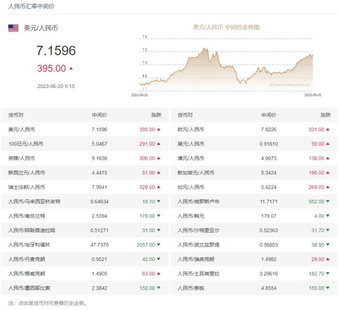 据央行网站消息,中国人民银行授权中国外汇交易中心公布,2023年6月20日银行间外汇市场人民币汇率中间价为1美元对人民币7.1596元,前一交易日人民币汇率中间价为1美元对人民币7.1201元。