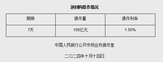 据央行网站消息,为维护银行体系流动性合理充裕,2024年10月14日人民银行以固定利率、数量招标方式开展了195亿元逆回购操作。