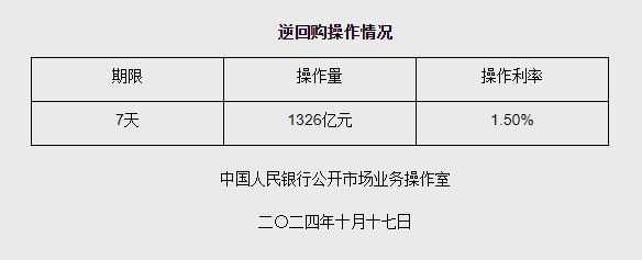 据央行网站消息,为维护银行体系流动性合理充裕,2024年10月17日人民银行以固定利率、数量招标方式开展了1326亿元逆回购操作。