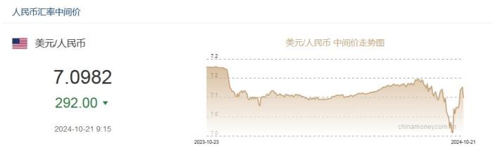 据中国外汇交易中心网站消息,中国人民银行授权中国外汇交易中心公布,2024年10月21日银行间外汇市场人民币汇率中间价为:1美元对人民币7.0982元。