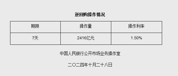 据中国人民银行网站消息,为维护月末银行体系流动性合理充裕,2024年10月28日人民银行以固定利率、数量招标方式开展了2416亿元逆回购操作。