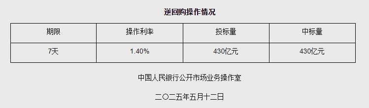 5月12日央行开展430亿元7天期逆回购操作