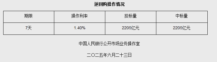 据央行网站消息,2025年6月23日中国人民银行以固定利率、数量招标方式开展了2205亿元逆回购操作。